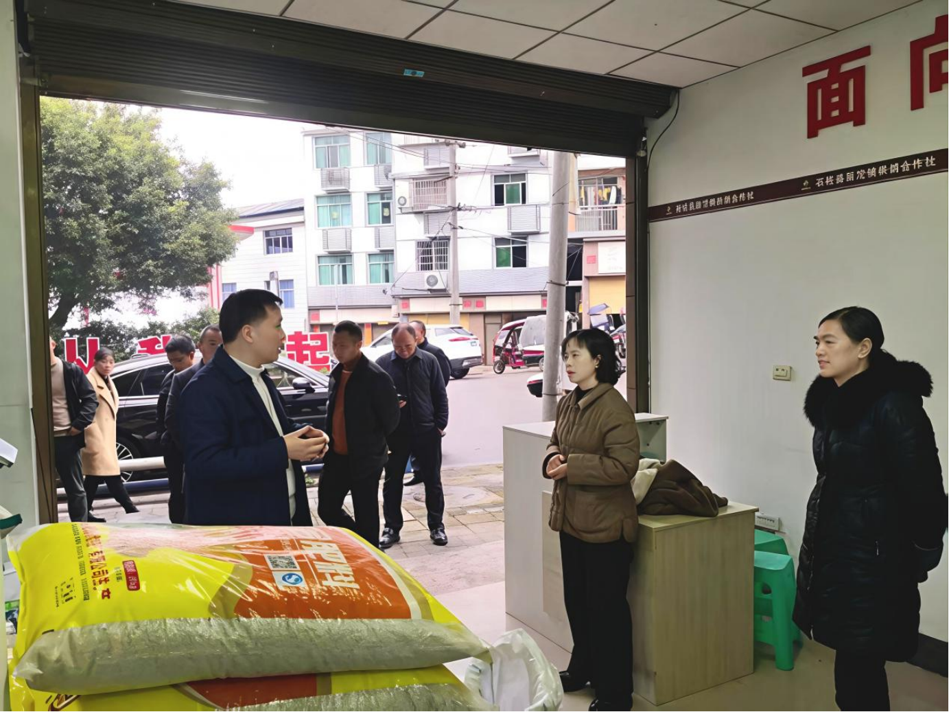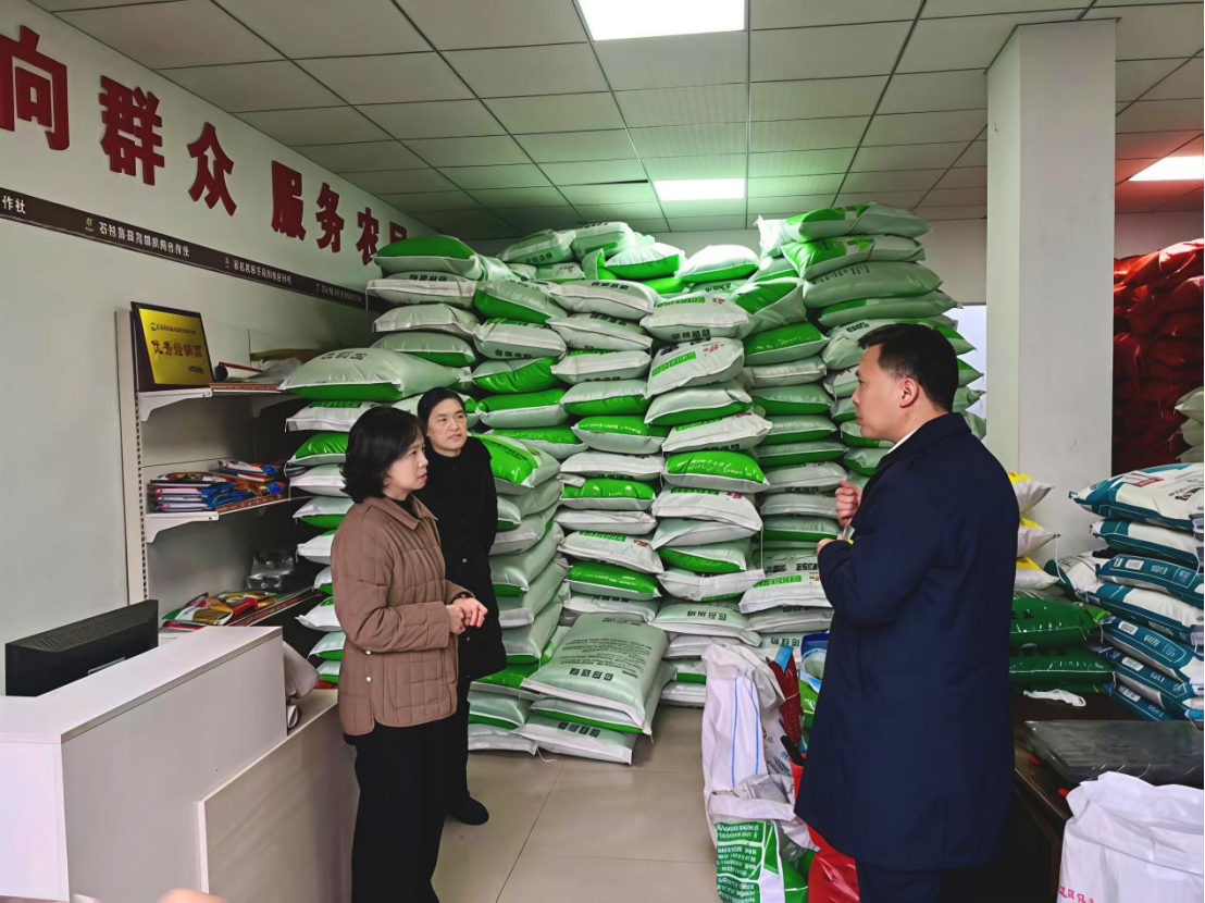 王淑蓉一行实地察看西沱镇农资加盟网点的仓储区域、农资货架,详细询问化肥、农药、农膜等春耕必备物资的储备数量、品种规格、价格走势及配送情况,仔细核查农资产品质量合格证明、进销货台账,详细了解网点运营模式、服务范围及当前春耕保供工作中存在的困难和问题。